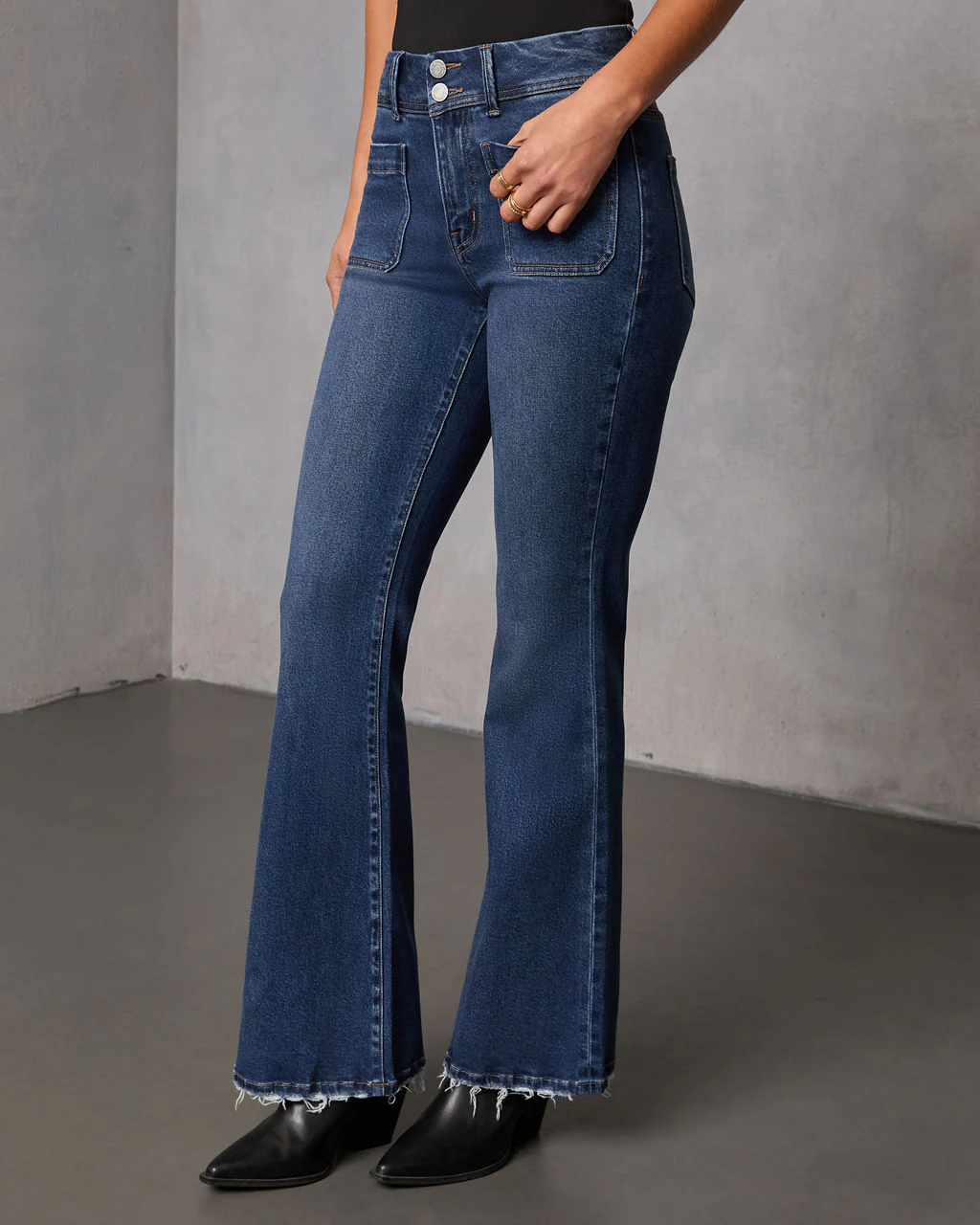 Discover the leg-lengthening effect of the perfect flare jeans. The Helaine Stretch High Rise Flare Jeans are ready to become a staple in your wardrobe. Made from comfortable stretch denim, these jeans are designed for everyday wear. Subtle whiskering and frayed trims add a vintage touch to the dramatic flare silhouette. With a classic 4-pocket design and a secure zip fly with a dual-button closure, they blend timeless style with a modern twist.
