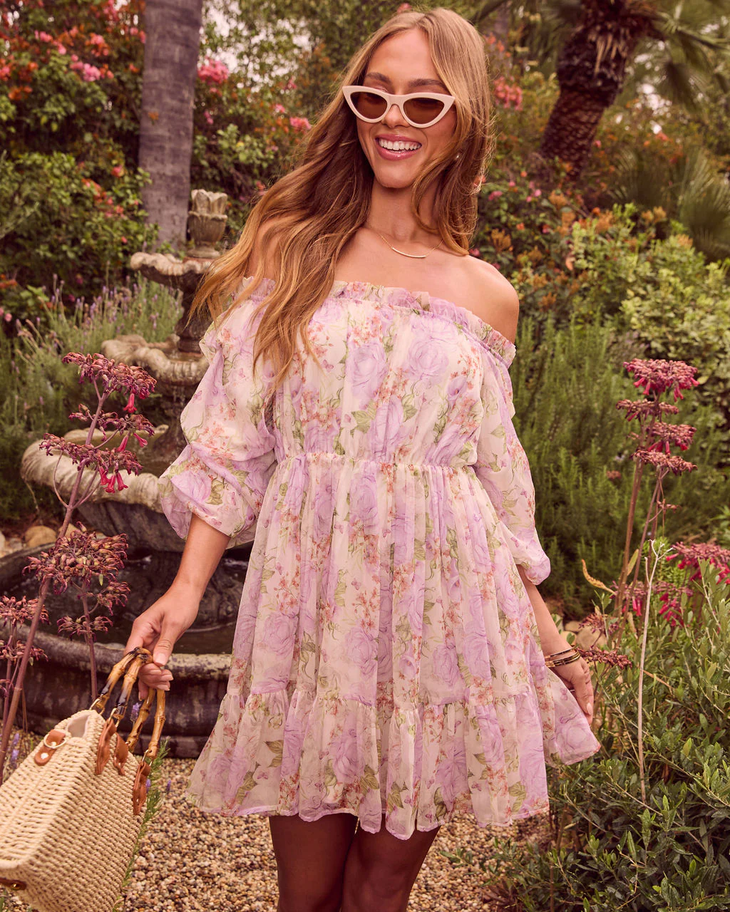Light, airy, and full of spring vibes, the Leslie Off The Shoulder Mini Dress is your go-to for making every moment feel special. Made from lightweight floral chiffon fabric, this dress flows effortlessly for a look that’s as breezy as it feels. The elastic neckline trim with ruffle detail adds a romantic touch, while the blouson sleeves with elastic cuffs bring soft volume and charm.